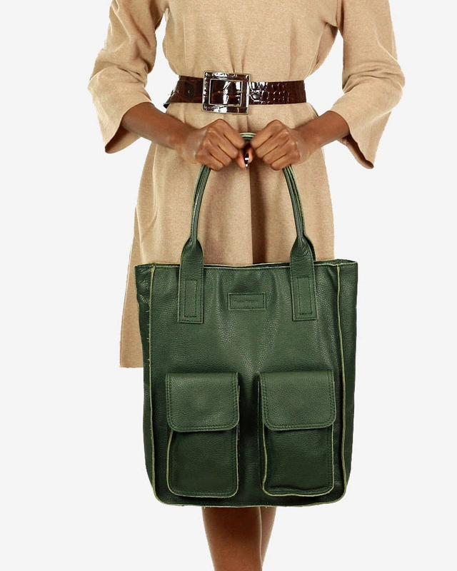 Ciemnozielona torebka damska typu shopper bag z kieszeniami