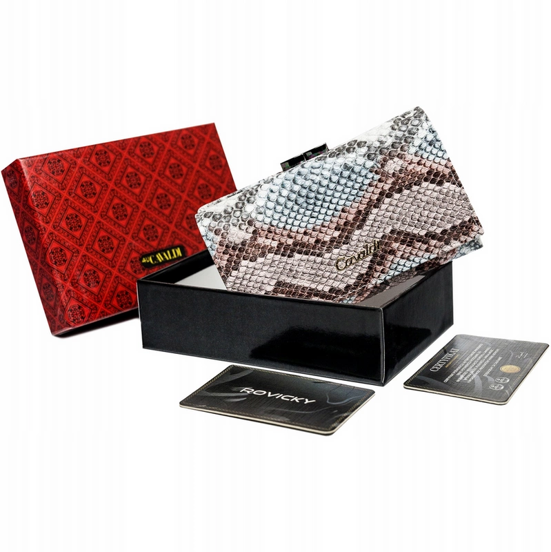 - Portfel jest odszyty z najwyższej jakości skóry naturalnej i ekologicznej. Środek portfela jest wykończony skórą naturalną, zaś strona zewnętrzna to skóra eko o fakturze imitującej skórę węża;