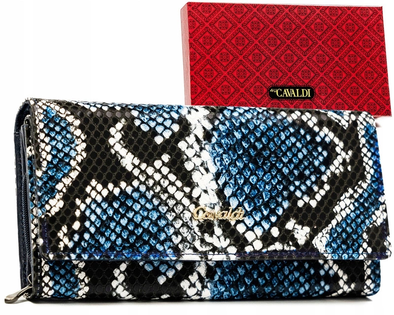 Damski portfel marki Cavaldi wykonany jest ze skóry naturalnej z fakturą skóry węża, co nadaje mu ekskluzywny i modny charakter. Duży, podłużny fason o poziomej orientacji wyposażono w złote okucia i zatrzask, które podkreślają elegancję produktu. Widoczne logo producenta oraz oryginalne pudełko dodają mu prestiżu, a przezroczysta przegroda pozwala na umieszczenie zdjęcia.