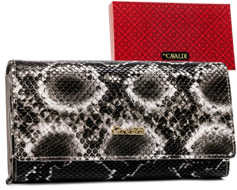 - Duży, poziomy portfel damski Cavaldi został wykonany ze skóry naturalnej z fakturą skóry węża, co nadaje mu luksusowy i nowoczesny wygląd. Złote okucia oraz praktyczny zatrzask podkreślają elegancję modelu, a subtelne logo producenta dodaje prestiżu.