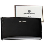 Duży portfel damski ze skóry ekologicznej w czarnym kolorze zamykany suwakiem i zatrzaskiem - Peterson