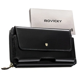 Skórzany portfel damski w czarnym kolorze zamykany suwakiem i zatrzaskiem - Rovicky